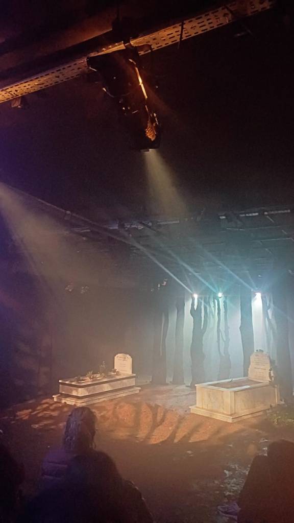 Oyun saati yaklaşırken, içeri geçtik. Sahnenin olduğu kısım, mezarlık olarak dekore edilmişti.