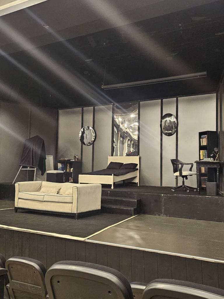 Sahnede arka planda bir yatak odası, ön planda bir koltuk, sağ taraftaysa masası ve kütüphanesi olan bir çalışma alanı bulunuyor. Yatak odası kısmında metal renkli dekoratif objeler var. (Bir tablo ya da sanat eseri olarak adledilmiş olabilirler, o kısmı muhtemelen kaçırdım.) Işte o tam ortadaki.